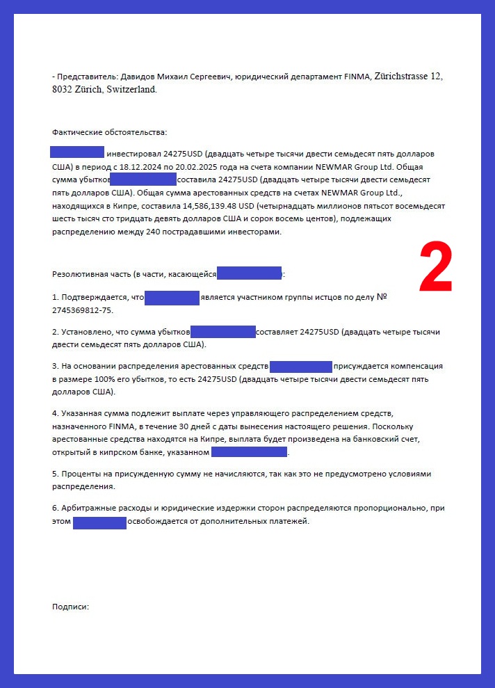 *** инвестировал 24275 USD (двадцать четыре тысячи двести семьдесят пять долларов США) в период с 18.12.2024 по 20.02.2025 года на счета компании NEWMAR Group Ltd. Общая сумма убытков *** составила 24275USD (двадцать четыре тысячи двести семьдесят пять долларов США). Общая сумма арестованных средств на счетах NEWMAR Group Ltd., находящихся в Кипре, составила 14,586,139.48 USD (четырнадцать миллионов пятьсот восемьдесят шесть тысяч сто тридцать девять долларов США и сорок восемь центов), подлежащих распределению между 240 пострадавшими инвесторами.